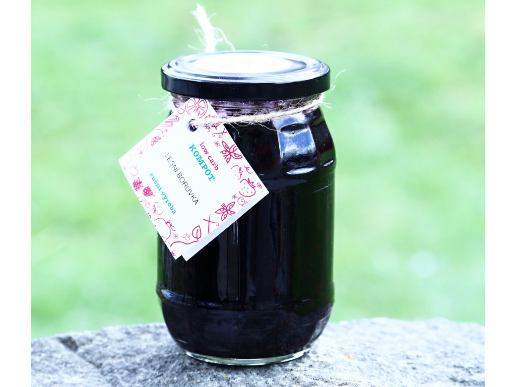 Lahodný kompot bez cukru z lesních borůvek, slazený xylitolem. Do nálevu jsme přidali citrónovou šťávu. Kompot je méně sladký.